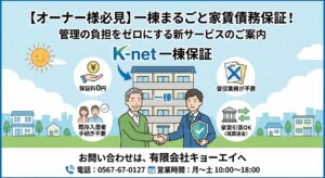 - 【オーナー様必見】一棟まるごと家賃債務保証!管理の負担をゼロにする新サービスのご案内アパートやマンションを経営されるオーナー様、日々の管理業務で「家賃の滞納」や「入居者様とのやり取り」に頭を悩ませてはいませんか? この度、弊社有限会社キョーエイでは、オーナー様・管理会社様の切実な声から生まれた画期的なサ […]